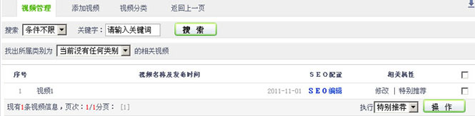 3.在“在视频列表”,设置视频的SEO配置(详细【3.4.1】章节进行介绍)、修改、是否推荐,删除等操作。