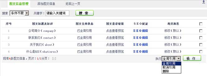 2.在“图文信息管理”, 设置图文的SEO配置、修改、是否全局引用,删除等操作。