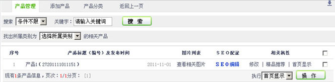 3.在“在产品列表”,设置产品的SEO配置(详细【3.4.1】章节进行介绍)、修改、是否推荐,是否首页显示、删除等操作。